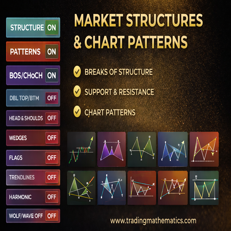 Our tools incorporate enhanced Fibonacci ratios with proprietary modifications. The system includes custom retracement and extension levels, ratio convergence calculations, and a proprietary Fibonacci grid system for identifying price targets.